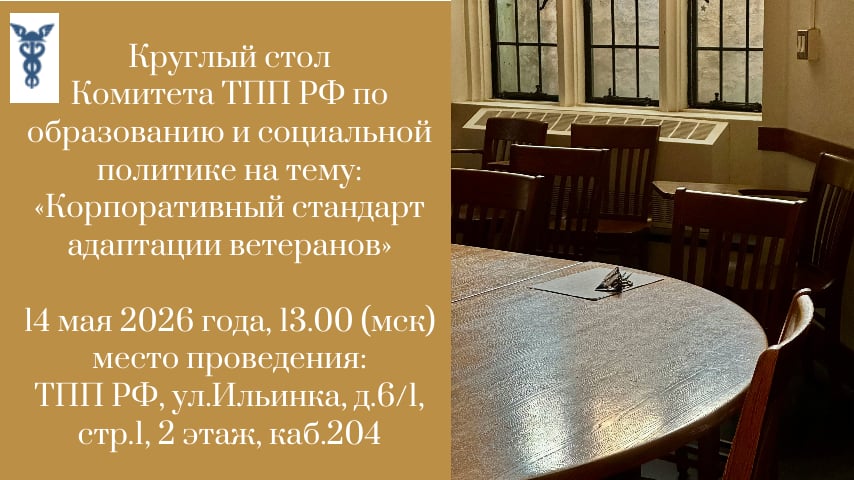 14 мая 2026 года в 13.00 в ТПП РФ в смешанном формате состоится заседание круглого стола Комитета ТПП РФ по образованию и социальной политике на тему: «Корпоративный стандарт адаптации ветеранов»
