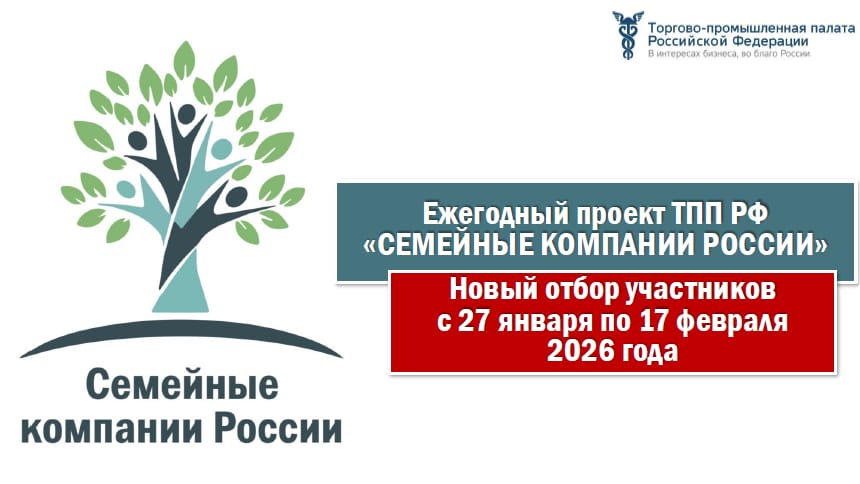 Сроки отбора: 27 января – 17 февраля 2026 года. Информация о процедуре и сроках отбора размещена на сайте ТПП РФ по ссылке https://family.tpprf.ru/semeinye-kompanii